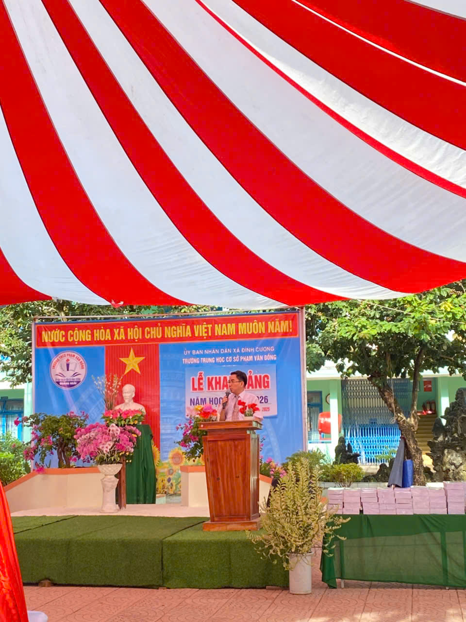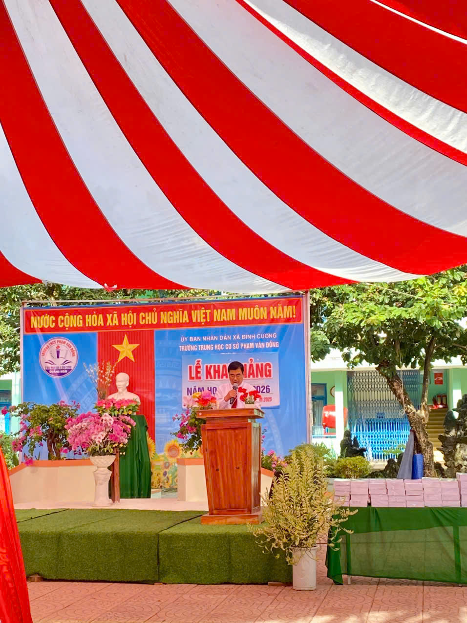 Sáng ngày 5 tháng 9 năm 2025, bầu trời xã Đình Cương trong xanh và mát mẻ, gió nhẹ khẽ rung rinh những tán cây phượng vĩ nơi sân trường. Hôm nay là một ngày đặc biệt – ngày khai giảng năm học mới 2025 – 2026. Ngay từ sáng sớm, toàn thể thầy cô giáo, các bậc phụ huynh và hơn bốn trăm học sinh của trường THCS Phạm Văn Đồng đã có mặt đông đủ, ai nấy đều vui tươi, phấn khởi.
