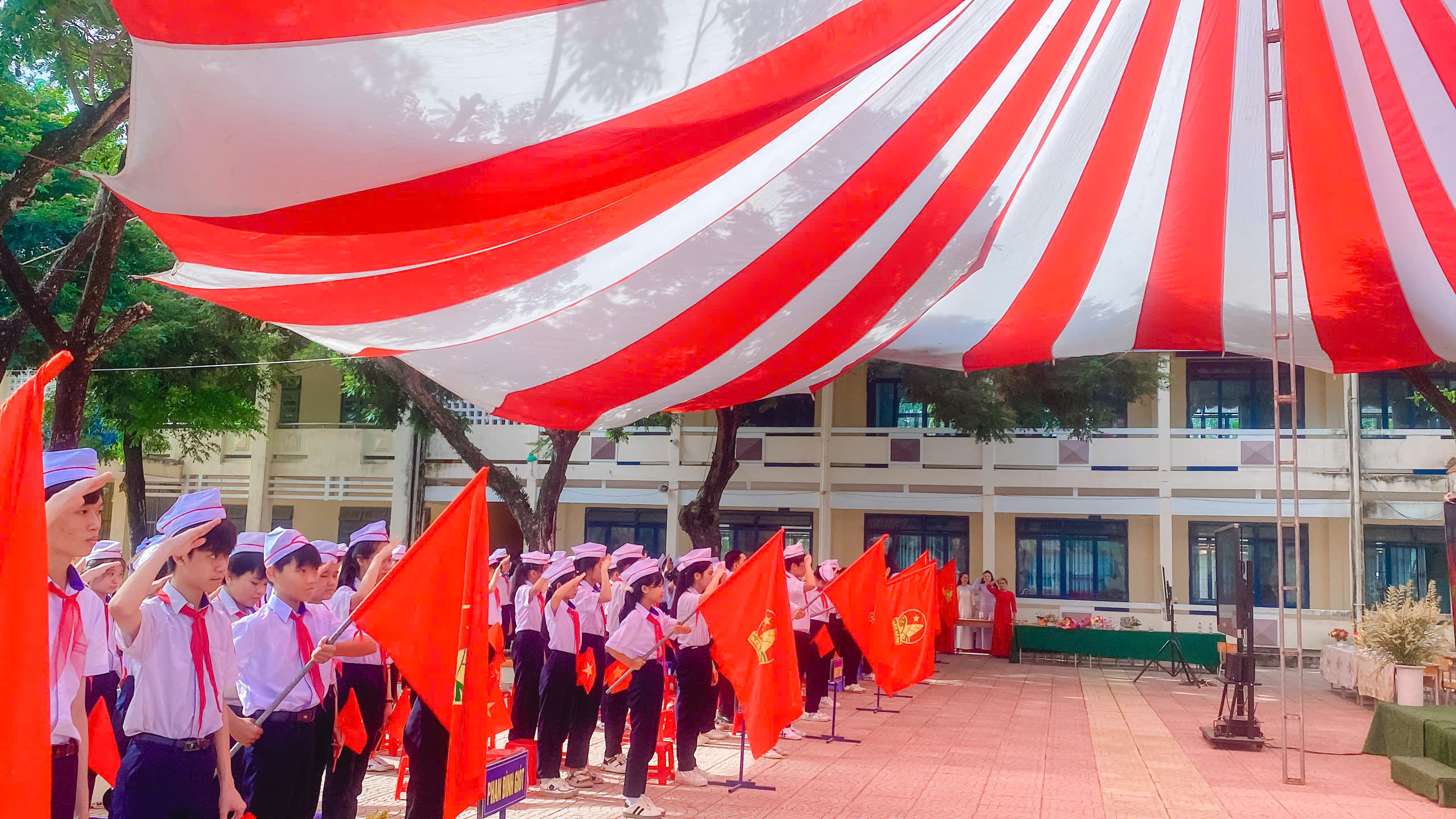 Đúng 8 giờ, buổi lễ khai giảng bắt đầu bằng màn chào cờ trang nghiêm. Khi quốc ca vang lên, cả sân trường lặng im, hàng trăm đôi mắt hướng về lá cờ đỏ sao vàng đang tung bay.