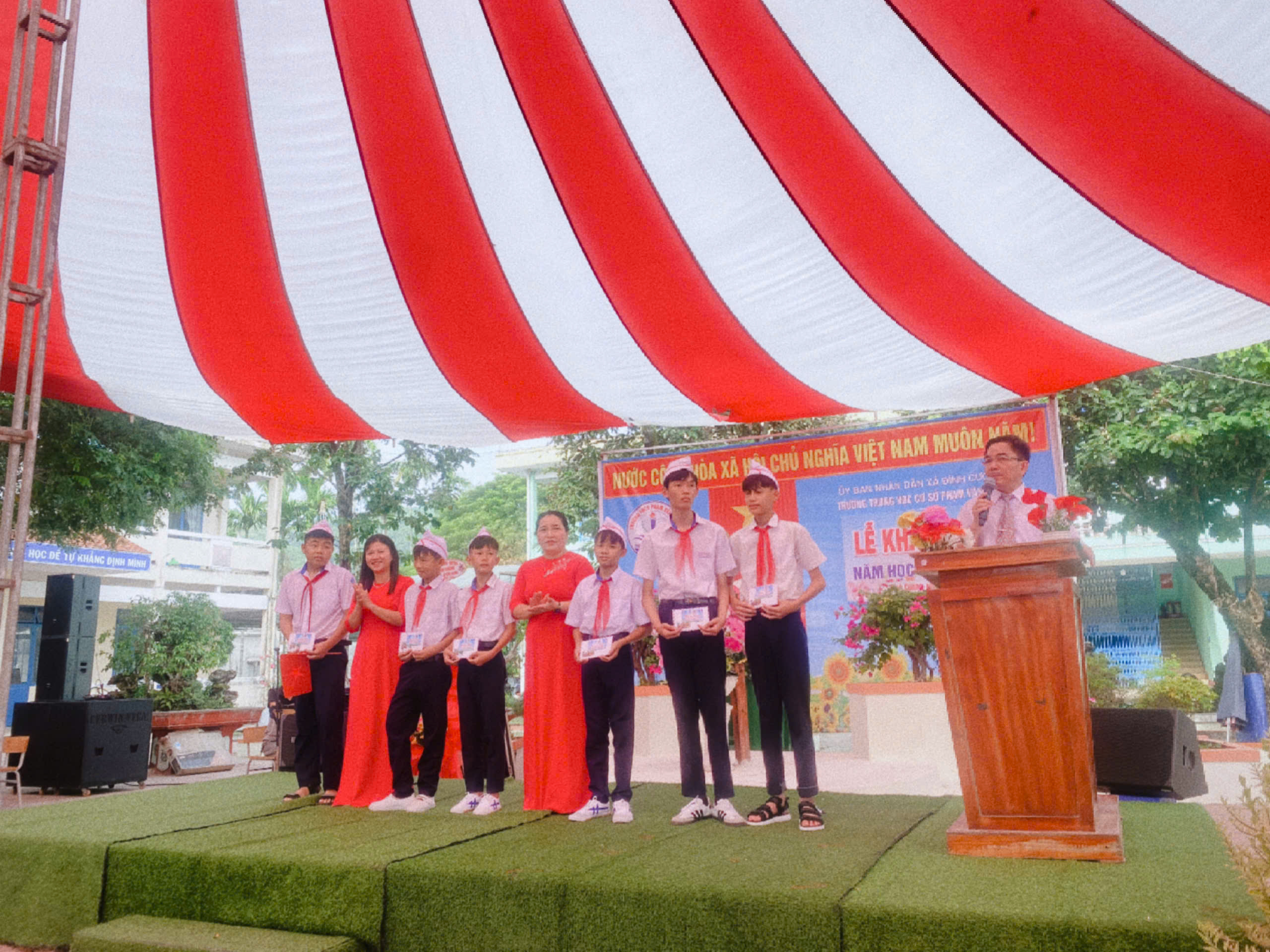 Phần lễ tiếp theo là diễn văn khai giảng ngắn gọn, đầy xúc động. Thầy hiệu trưởng nhắc lại những thành tích nổi bật của năm học trước: nhiều học sinh đạt giải học sinh giỏi cấp huyện, cấp tỉnh; phong trào thi đua của nhà trường luôn đứng trong tốp đầu của huyện.